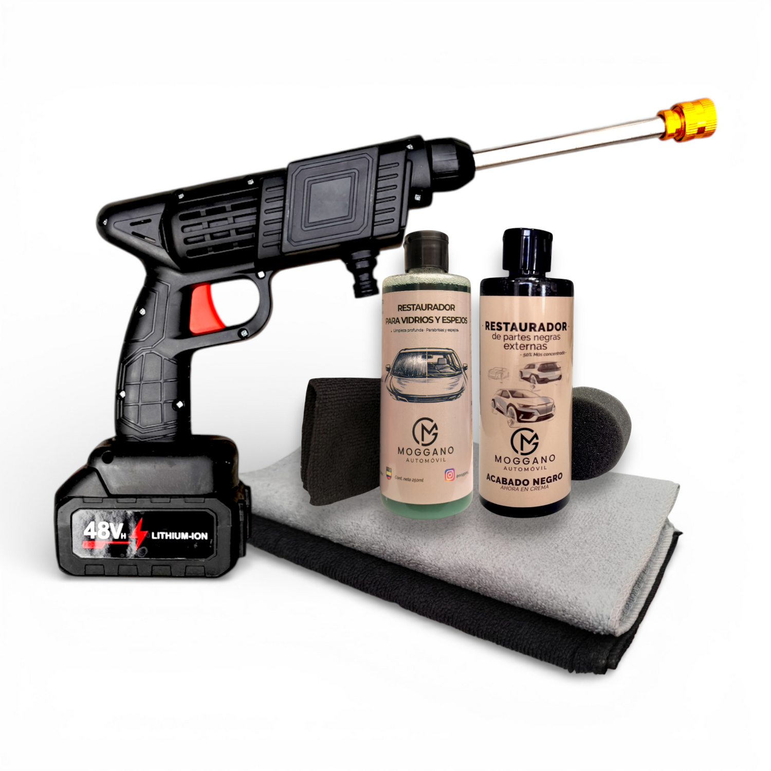 Kit completo para lavar y restaurar tu auto. Incluye hidrolavadora portátil, restaurador de vidrios y partes negras y microfibras. Solución total exterior. 🤎